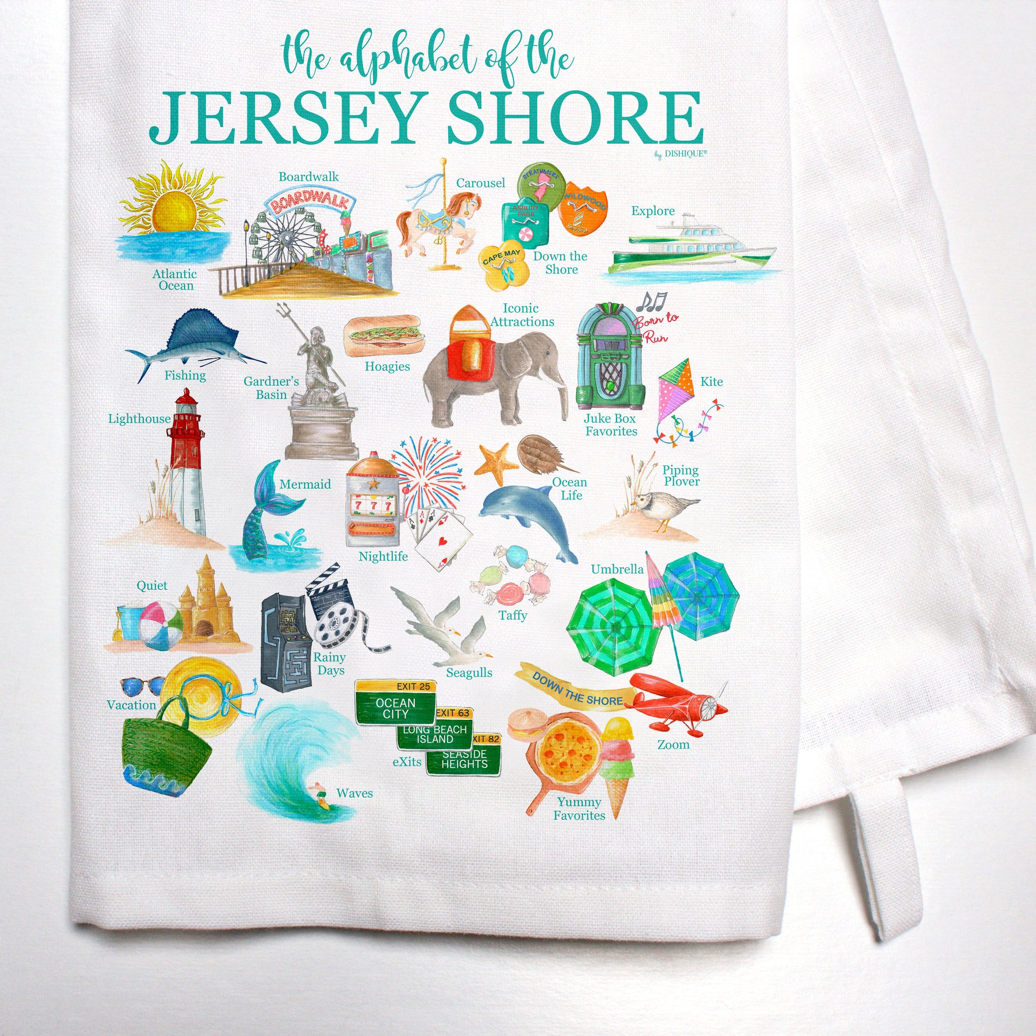 Our 100% cotton dish towel features our Jersey Shore Alphabet. A clever collection of A...